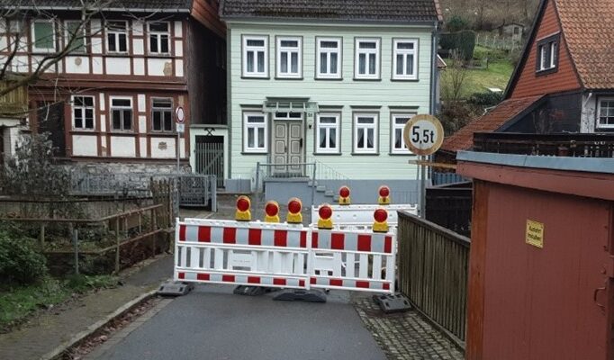 In der Bergstadt Lautenthal ist die Brücke über die Laute im Bereich Hahnenkleer Straße 26 – 28 für den motorisierten Verkehr gesperrt. Das Auflager des nördlichen Geländers hatte sich gelöst. Die losen Bauteile wurden geborgen und das fehlende Geländer durch einen Bauzaun gesichert. Die Benutzung für Fußgänger ist weiterhin möglich.