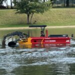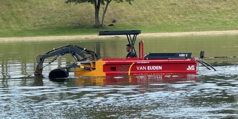 Die Wasserpest wird mit Hilfe eines Amphibienbootes, an dem ein hydraulischer Arm mit einem sogenannten Krautrechen befestigt ist, kurz über dem Grund des Badesees ausgerissen und entsorgt. Diese invasive Art ist die einzige Möglichkeit, der Wasserpest Herr zu werden.