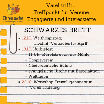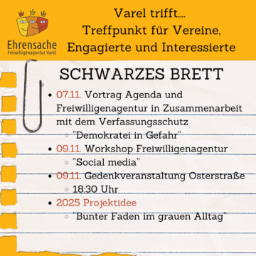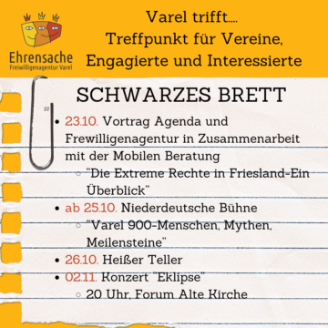 Am Freitag fand das Varel trifft im Tivoli statt, bei dem sich verschiedene Vereine vorgestellt haben. Es wurden spannende Einblicke gegeben und über anstehende Veranstaltungen informiert. Gemeinsam haben wir gesammelt, was in den nächsten Wochen auf uns zukommt.