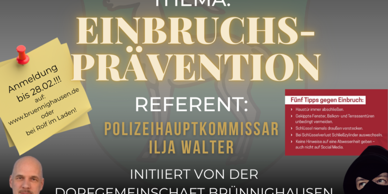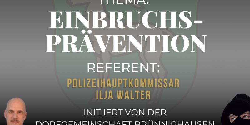 Liebe Brünnighäuser, mehrfach wurde der Dorfgemeinschaftsverein darauf angesprochen, ob es nicht sinnvoll wäre, nach Einbrüchen in Brünnighausen im vergangenen Jahr, eine Infoveranstaltung zum Thema Einbruchsschutz durchzuführen. Daraufhin haben wir Kontakt…