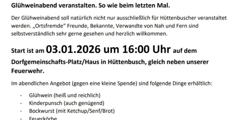 Bereits stattgefunden Veranstaltung II. Glühweinabend in Hüttenbusch Ideen-Schmiede Hüttenbusch Posted on 18. Dez. 202518. Dez. 2025 Read More