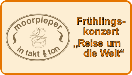 08. Mai Veranstaltung Frühlingskonzert des Chores „Moorpieper in Takt und Ton“ Chor „Moorpieper in Takt und Ton“ Posted on 14. Apr. 202615. Apr. 2026 Unter dem Motto „Reise um die Welt“ erwartet die Besucherinnen und Besucher ein abwechslungsreiches musikalisches Programm. Der Chor präsentiert frühlingsfrische Lieder aus verschiedenen Ländern und Kulturen und nimmt das Publikum… Read More