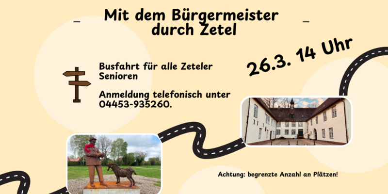 Gemeindefahrt mit dem Bürgermeister Ein besonderer Nachmittag für Seniorinnen und Senioren in der Gemeinde Zetel findet am 26. März statt. Die Gemeinde Zetel lädt alle interessierten Seniorinnen und Senioren –…