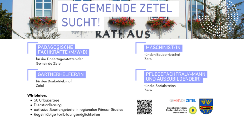 PÄDAGOGISCHE FACHKRÄFTE (M/W/D) für die Kindertagesstätten der Gemeinde Zetel MASCHINIST/IN für den Baubetriebshof Zetel GÄRTNERHELFER/IN für den Baubetriebshof Zetel PFLEGEFACHFRAU/-MANN UND AUSZUBILDENDE(R) für die Sozialstation Zetel Wir bieten: 30 Urlaubstage…