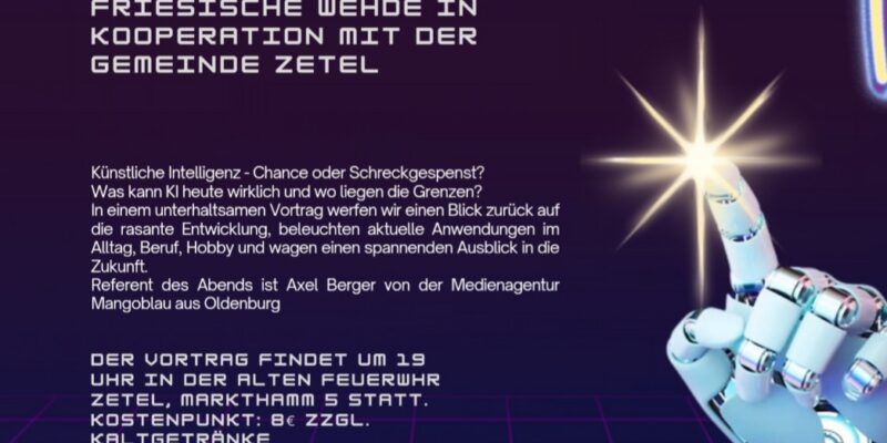 Am Dienstag, den 14.04.2026 findet in der Alten Feuerwehr Zetel, Markthamm 5, ein Vortrag über künstliche Intelligenz statt. Der LandFrauenverein Friesische Wehde hat diesen Vortrag in Kooperation mit der Gleichstellungsbeauftragten…