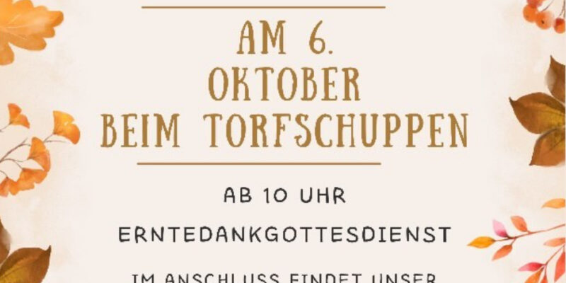 Die Dorfgemeinschaft Neuenburgerfeld lädt am 6. Oktober zum Herbstfest beim Torfschuppen ein. Beginn ist um 10 Uhr mit einem Erntedankgottesdienst. Im Anschluss findet das Herbstfest mit Bratwurst, selbstgemachtem Kuchen, Kaffee,…