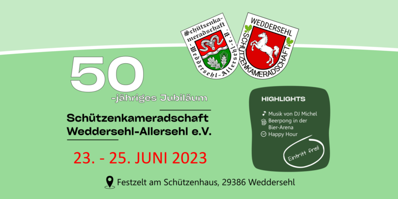 Die Schützenkameradschaft Weddersehl-Allersehl e.V. freut sich auf ihr 50-jähriges Jubiläum und möchte dieses vom 23. bis 25. Juni 2023, mit ihren Gästen, gebührend feiern. Kommt vorbei und feiert mit. Schützenfestablauf…