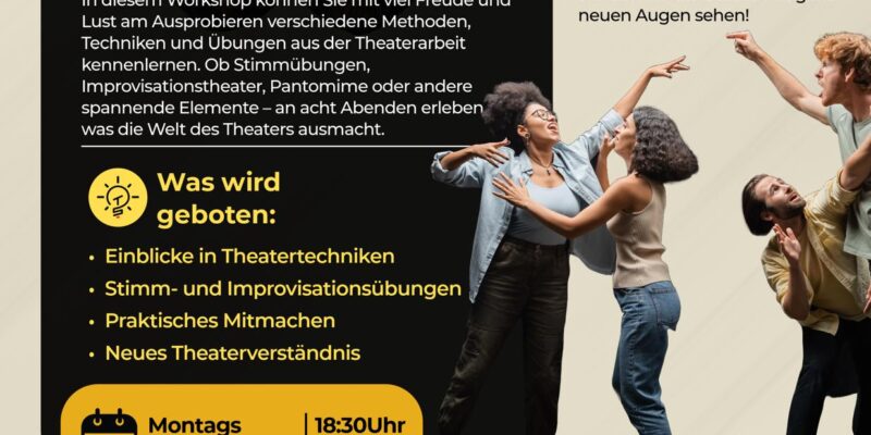 Beginn: 17.02.2025 8 x montags 18:30 Uhr bis 20:30 Uhr Kosten: 55 € pro Person Was bedeutet „Theaterarbeit“ wirklich? Welche Techniken erlernen Schauspielstudenten, um auf der Bühne zu glänzen? Probieren…