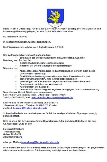 [Amtlicher Beitrag] Der Flecken Ottersberg sucht eine Büchereikraft