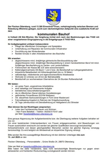 [Amtlicher Beitrag] Der Flecken Ottersberg sucht zum nächstmöglichen Zeitpunkt eine zusätzliche Kraft (m,d,w) auf dem kommunalen Bauhof