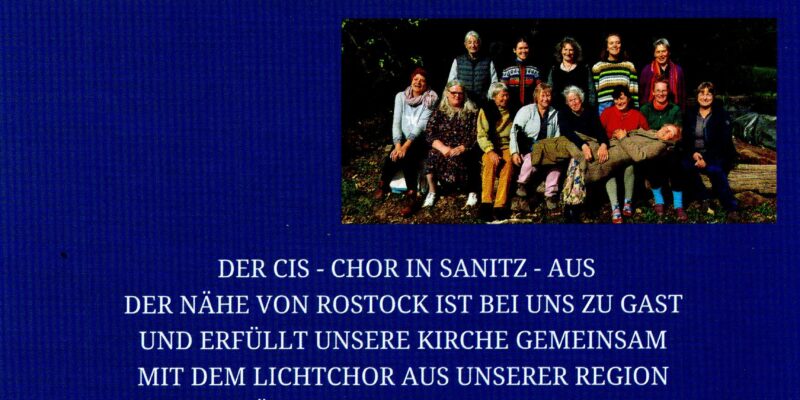 19. Apr. Veranstaltung 2 Chöre in der Kirche Posted on 16. Apr. 2026 Konzert mit 2 Chören CiS-Chor Sanitz und LichtChor unter der Leitung von Mathilde Helm Zum Kalender hinzufügen Google Kalender iCalendar Outlook 365 Outlook Live Details Datum: 19. April Zeit: 16:00 - 17:00 Veranstaltungskategorien: Konzert, Veranstaltungen Veranstaltung-Tags:chorkonzert
