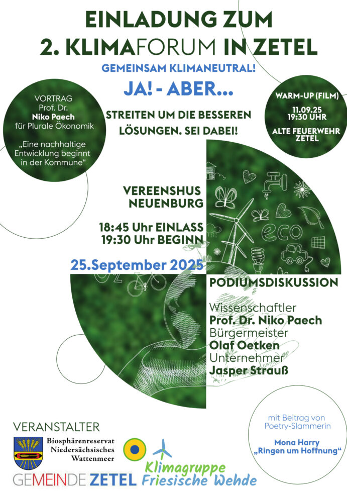 Am 25.9. findet ab 19:30 Uhr das 2. Klimaforum im Vereenshuus Neuenburg statt. Neben einem Vortrag des Vertreters der Postwachstumsökonomie Prof. Dr. Niko Paech wird es eine Podiumsdiskussion mit ihm, Zetels Bürgermeister Olaf Oetken und Unternehmer Jasper Strauß von Kirchner-Ingenieure Varel geben.