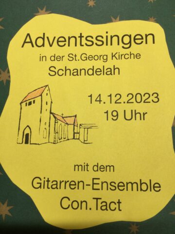 Am Donnerstag, den 14. Dezember um 19 Uhr, findet in diesem Jahr wieder das traditionelle Adventssingen in der St. Georg Kirche in Schandelah statt. Es singt und spielt das Gitarren-Ensemble Con.Tact unter der Leitung von Heide Viet. Zur Aufführung kommen mehrstimmige adventliche und weihnachtliche Sätze untermalt mit vorgetragenen Weihnachtsgedichten. Wir freuen uns auf Ihren Besuch. E.Halbach