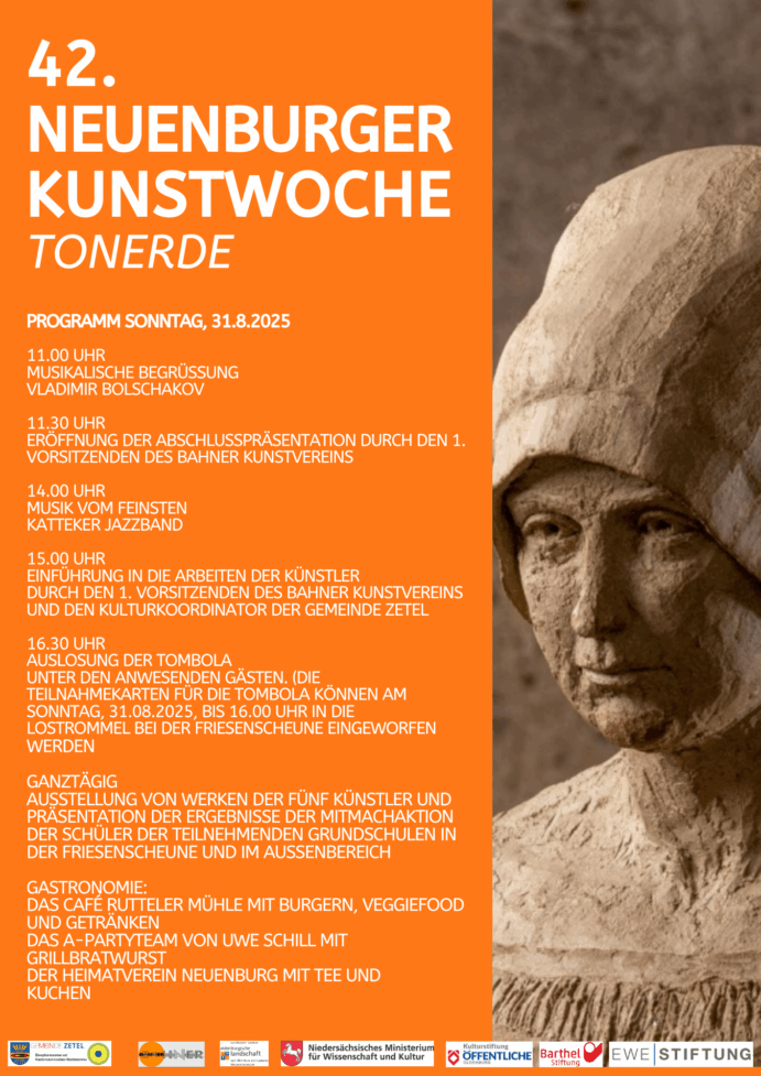 Abschlusstag und Höhepunkt der 42. Kunstwoche! Präsentation der vor Ort geschaffenen Kunstwerke am Sonntag, 31. August 2025 auf dem historischen Rauchkatengelände am Neuenburger Schloss. Mit Live-Musik, Burgern, Veggie-Food, Bratwurst, Wein, Bier und Tomobola.