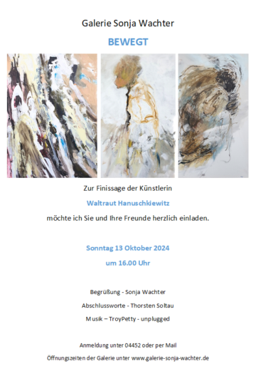 Zur Finissage der Künstlerin Waltraut Hanuschkiewitz am 13.10.2024 um 16 Uhr möchte ich Sie und Ihre Freunde herzlich einladen.