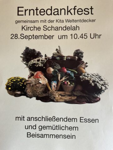 Am Sonntag, 28. September, feiert die Johannisgemeinde am Sandbach gemeinsam mit der Kita Weltentdecker um 10.45 Uhr in der Schandelaher Kirche das Erntedankfest. An den Gottesdienst schließt sich traditionell ein gemeinsames Mittagessen und gemütliches Beisammensein an, zu dem Pfarrer Jonas Stark und Kirchenvorstand ganz herzlich Jung und Alt eingeladen. Wer Erntegaben zum Ausschmücken der Kirche spenden möchte, kann diese am Freitag, 26. September, zwischen 15 und 16 Uhr direkt in der Kirche abgeben.