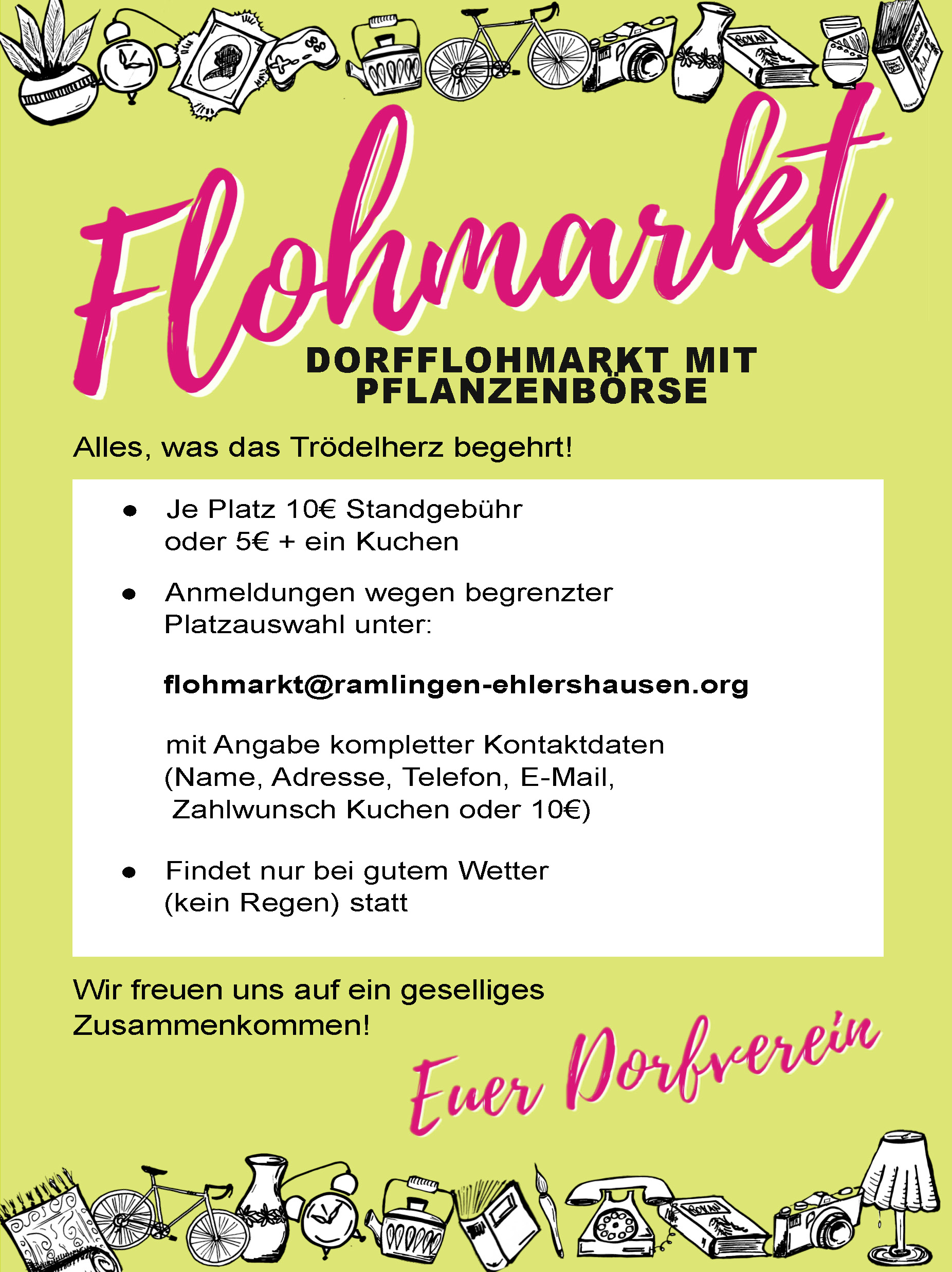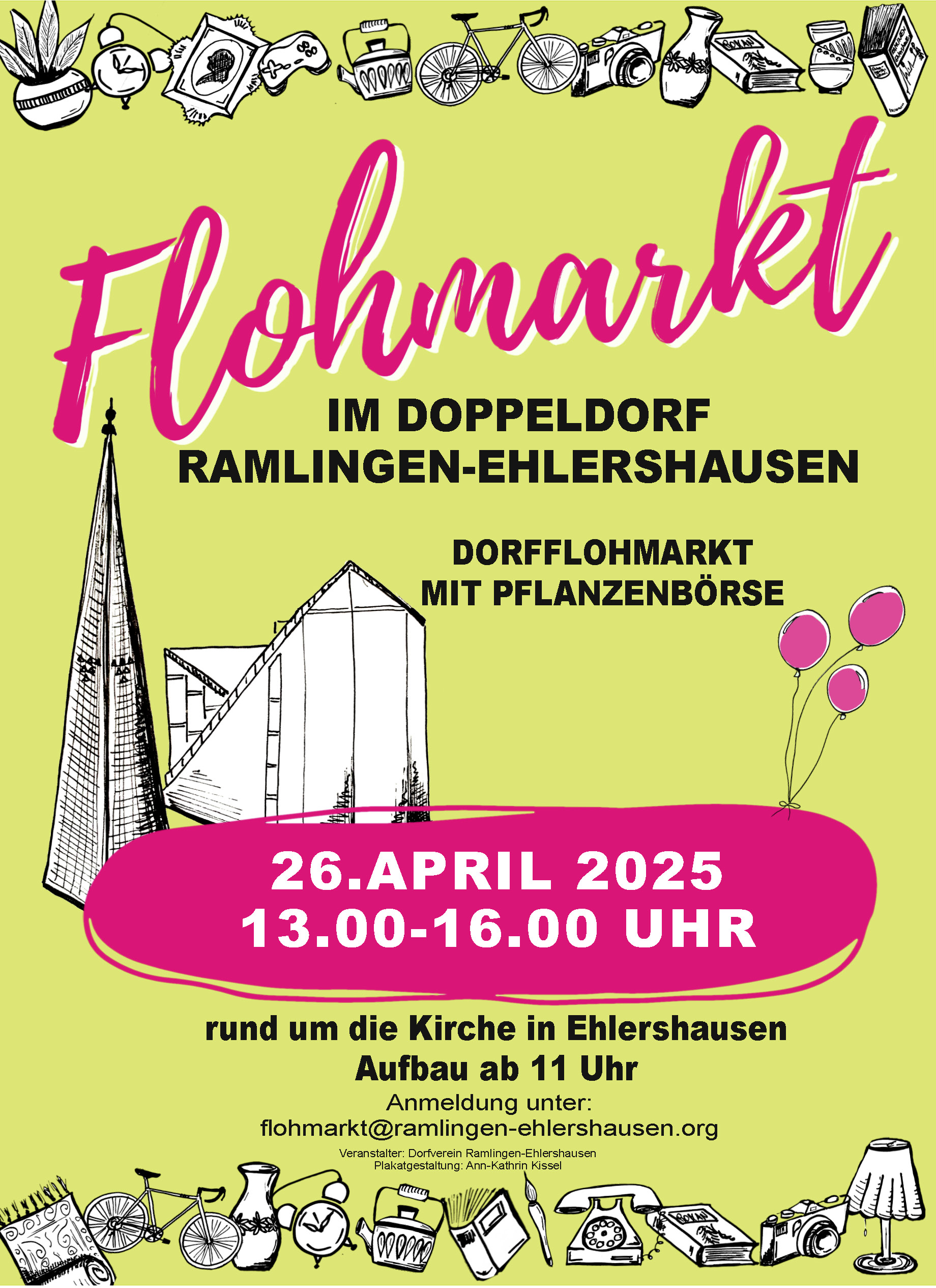 Der Dorfverein Ramlingen-Ehlershausen e.V. läd am 26. April 2025 von 13:00 bis 16:00 Uhr zum dritten Doppeldorf-Flohmarkt rund um die Kirche in Ehlershausen ein.