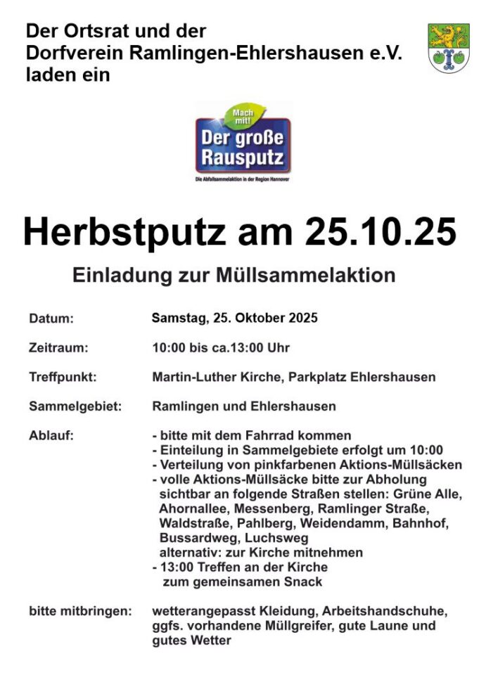 Frisch und gut erholt zurück aus dem Herbstferien wollen wir unser Dorf ein wenig auf Hochglanz polieren. Dafür treffen wir uns um 10:00 zur Einteilung der Sammelbereiche, Ausgabe der Warnwesten, Müllzangen und Müllbeutel an der Martin Luther Kirche. Bitte bringt gern auch die Westen mit, die versehentlich beim Frühjahrsputz verschwunden sind 😉