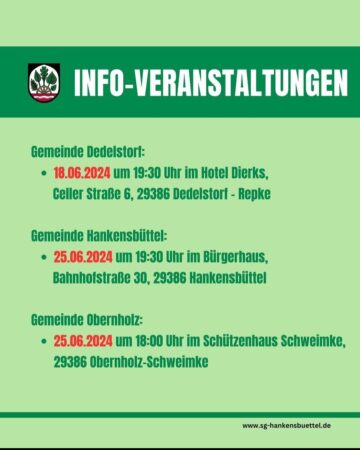 - Dienstag, den 25.06.2024 um 19:30 Uhr im Bürgerhaus, Bahnhofstraße 30, 29386 Hankensbüttel