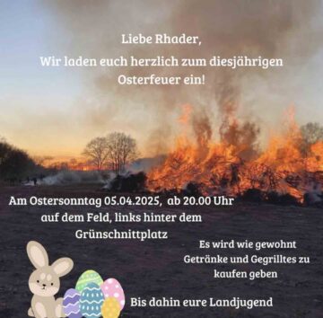 Osterfeuer am 05.04.2025 ab 20 Uhr: Mit Getränken, Gegrilltem und Musik ist für einen gemütlichen Abend gesorgt. Kommt vorbei – die Landjugend freut sich auf euch!Am Samstag, den 05.04.2025, laden wir euch herzlich zu unserem alljährlichen Osterfeuer ein. Ab 20 Uhr möchten wir gemeinsam mit euch am Feuer stehen, klönen und den Abend genießen. Für das leibliche Wohl ist bestens gesorgt: Es gibt Getränke, Gegrilltes und Musik – damit es bis spät in die Nacht gemütlich bleibt. Bringt gerne Freundinnen, Freunde und Familie mit. Wir freuen uns auf viele Besucherinnen und Besucher!