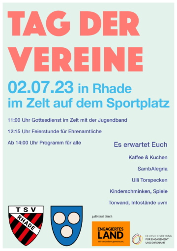 Die Gemeinde Rhade lädt zusammen mit dem TSV Rhade und der Kirchengemeinde Rhade zum Tag der Vereine am 02.07.2023