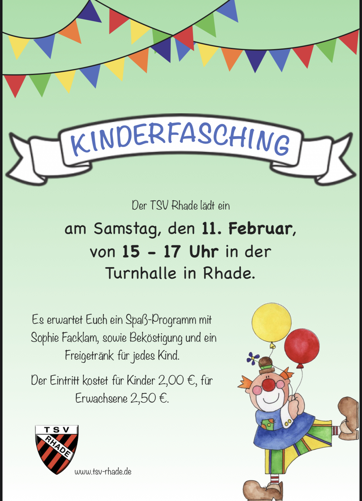 Am 11.2. findet von 15:00 bis 17:00 Uhr der Kinderfasching in der Turnhalle Rhade statt. Alle Kinder sind mit ihren Begleitungen herzlich eingeladen. |