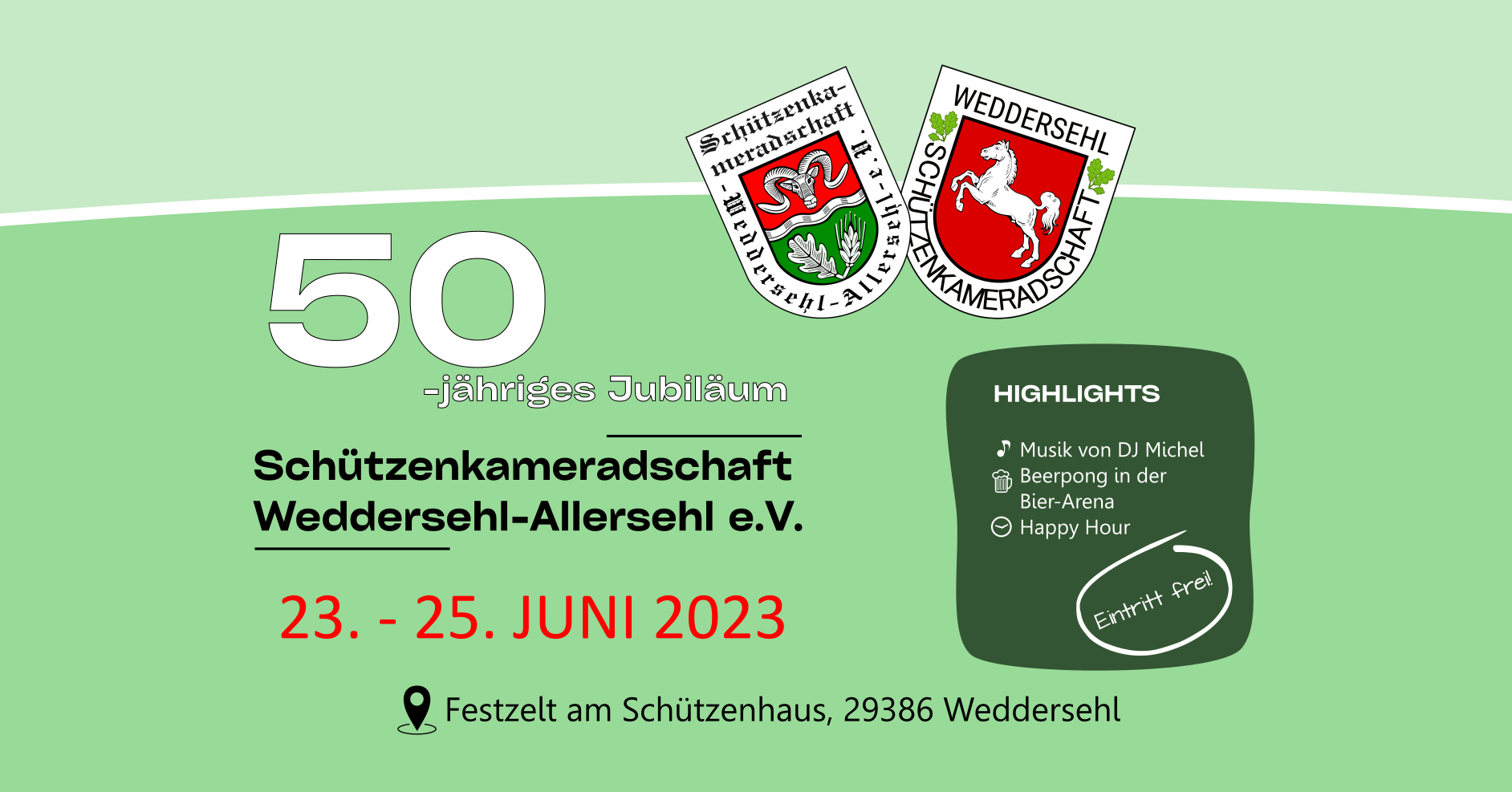 Die Schützenkameradschaft Weddersehl-Allersehl e.V. freut sich auf ihr 50-jähriges Jubiläum und möchte dieses vom 23. bis 25. Juni 2023, mit ihren Gästen, gebührend feiern. Kommt vorbei und feiert mit. Schützenfestablauf… |