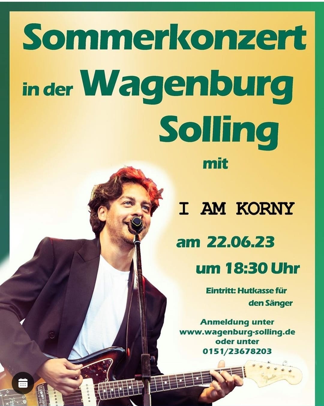 Sommerkonzert in der Wagenburg Solling mit I AM KORNY am 22.06.2023 um 18:30 Uhr Eintritt: Hutkasse für den Sänger Anmeldung unter: http://www.wagenburg-solling.de oder unter 015123678203 |