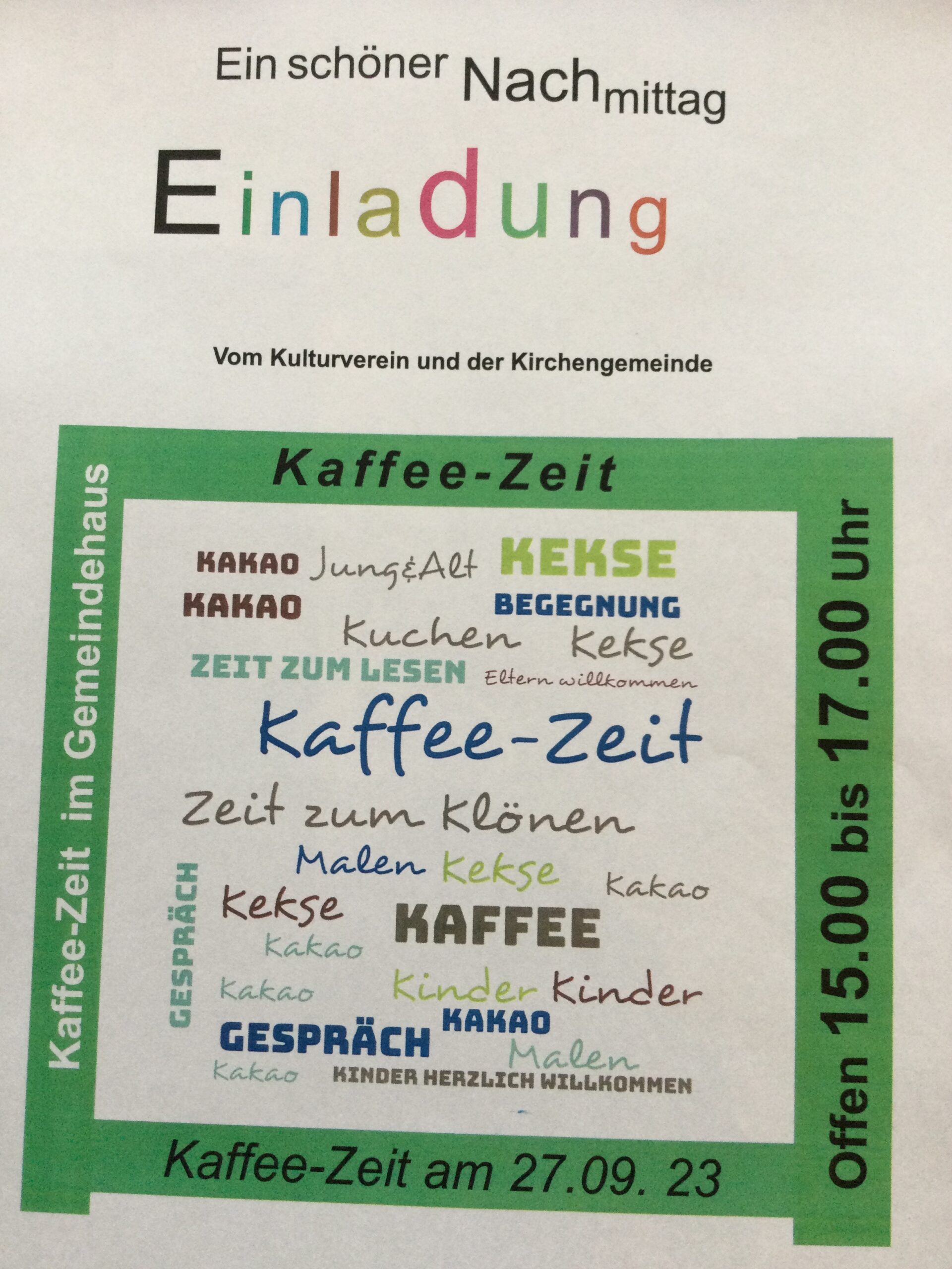 Gemeinsame Aktion von Kulturverein und Kirchengemeinde im Gemeindehaus an der Kirche Kaffee-Zeit am 1.11.2023 / 15 bis 17 Uhr |