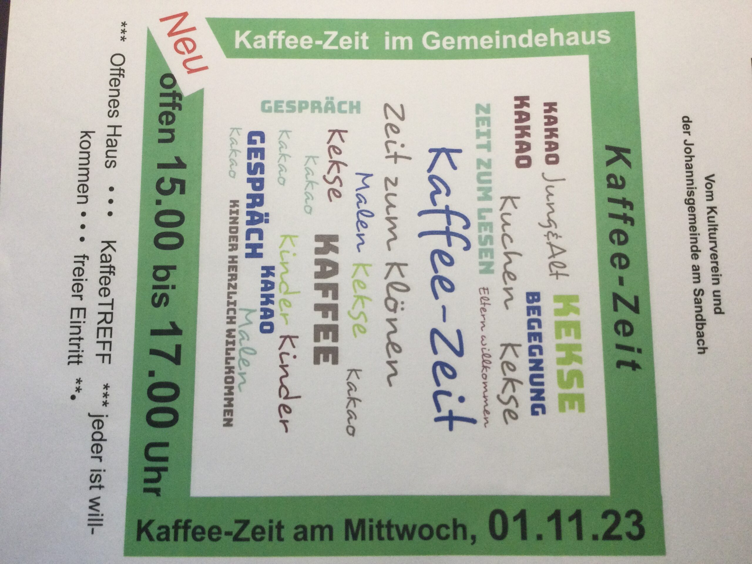 Gemeinsame Aktion von Kulturverein und Kirchengemeinde im Gemeindehaus an der Kirche Kaffee-Zeit am 1.11.2023 / 15 bis 17 Uhr |