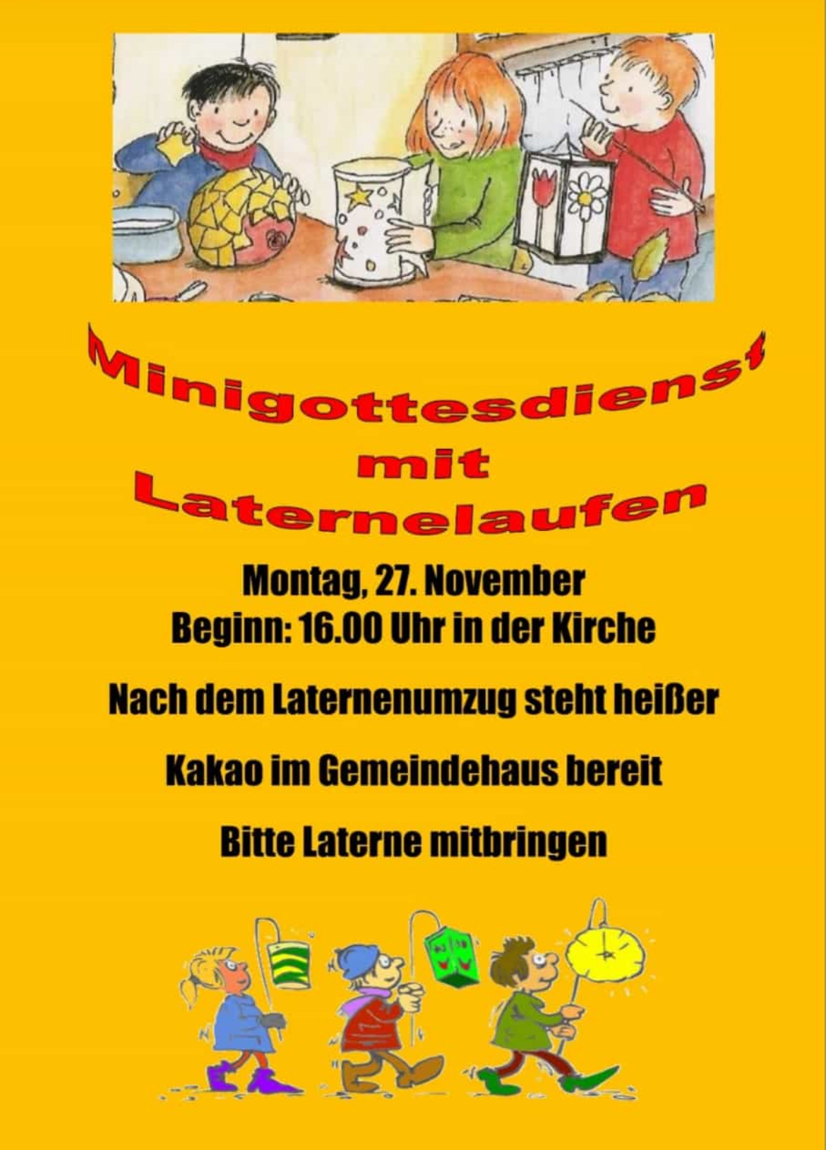 Am Montag, 27.11. lädt die Kirchengemeinde Rhade alle Kinder zu einem Minigottesdienst ein. Anschließend wird gemeinsam mit der Laterne gelaufen bevor im Gemeindehaus heißer Kakao getrunken werden kann.