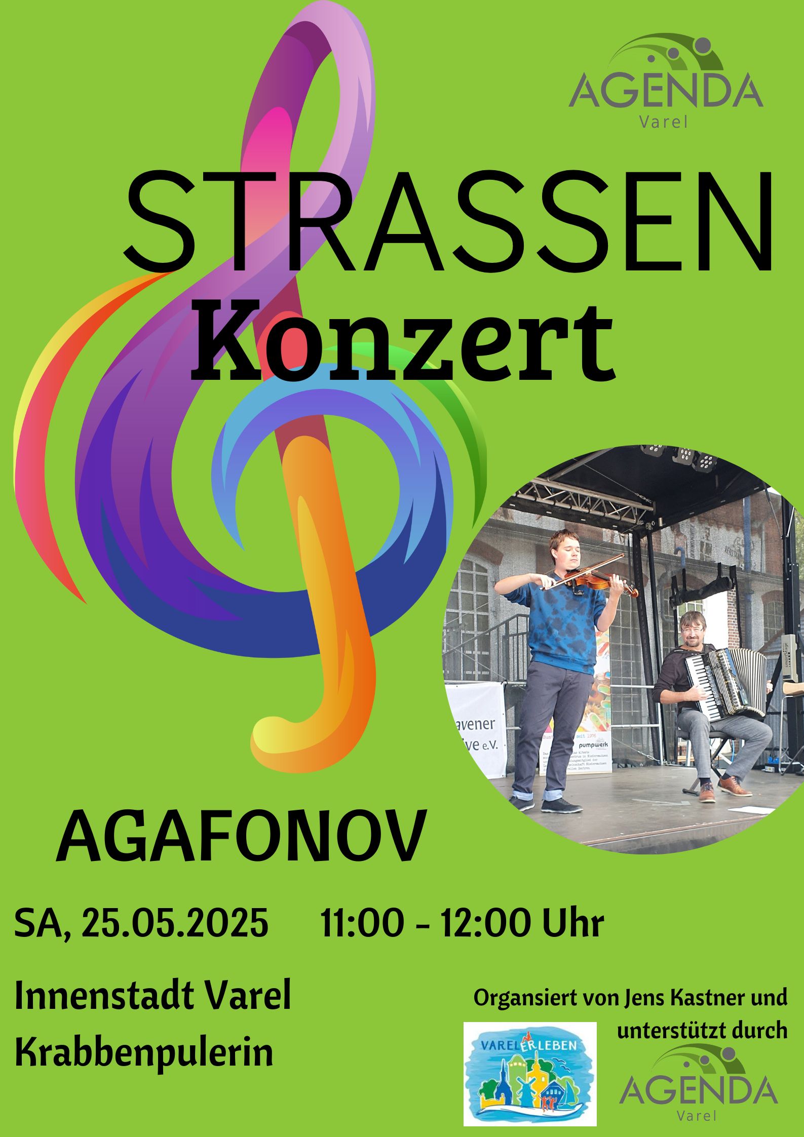 2. Straßenkonzert in der Innenstadt Varel Am 25.05.24 spiet die AGAFONOV Band bei der Krabbenpulerin. Die diesjährige Straßenkonzertreihe - organisiert von Jens Kastner - wird finanziert von der Erlebnisstadt Varel.…