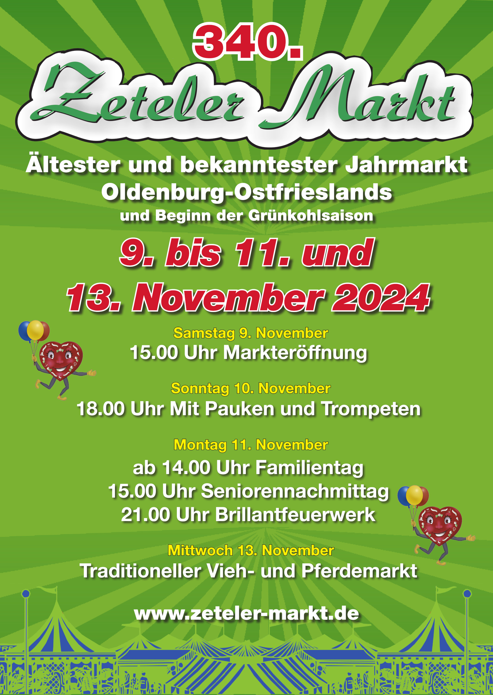 340. Zeteler Markt. Ältester Jahrmarkt Oldenburg-Ostfrieslands Mit Beginn der Grünkohlsaison beginnt auch die fünfte Jahreszeit in Zetel. Vom 9. bis 11. November sowie am Mittwoch, 13. November findet das Jahres-Highlight,…