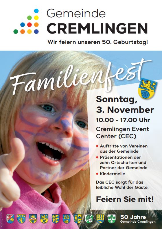 Die Gemeinde Cremlingen feiert am Sonntag, 3. November 2024, mit einem bunten Familienfest ihren 50. Geburtstag. Das Bühnenprogramm: 10:30 Uhr Eröffnungsrede durch Bürgermeister Detlef Kaatz und Grußwort von Rudi Beeken,…