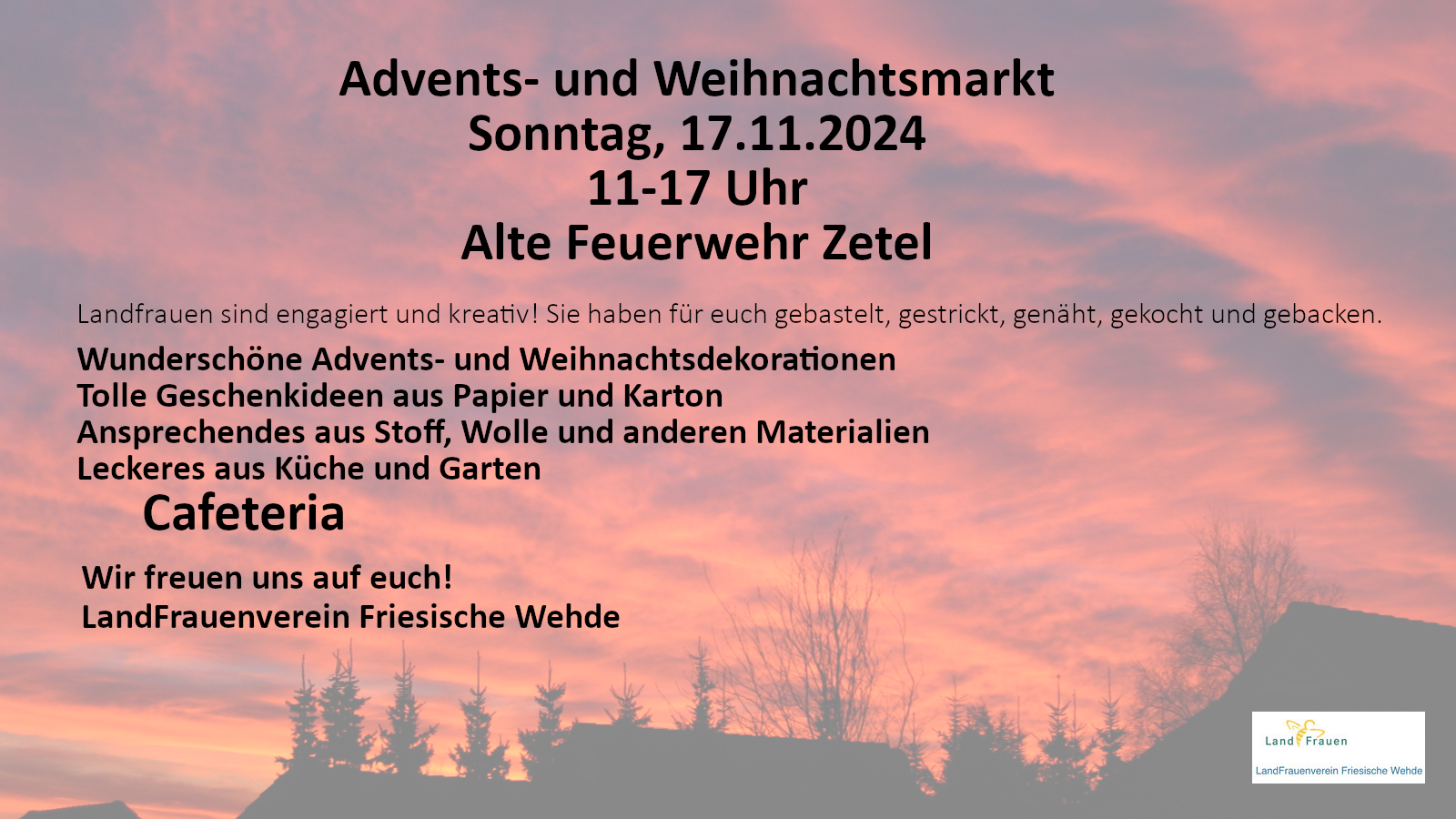 Am 17. November findet in der Alten Feuerwehr Zetel der Advents- und Weihnachtsmarkt der Landfrauen Friesische Wehde statt. Von 11 bis 17 Uhr werden die engagierten Mitglieder Advents- und Weihnachtsdeko,…