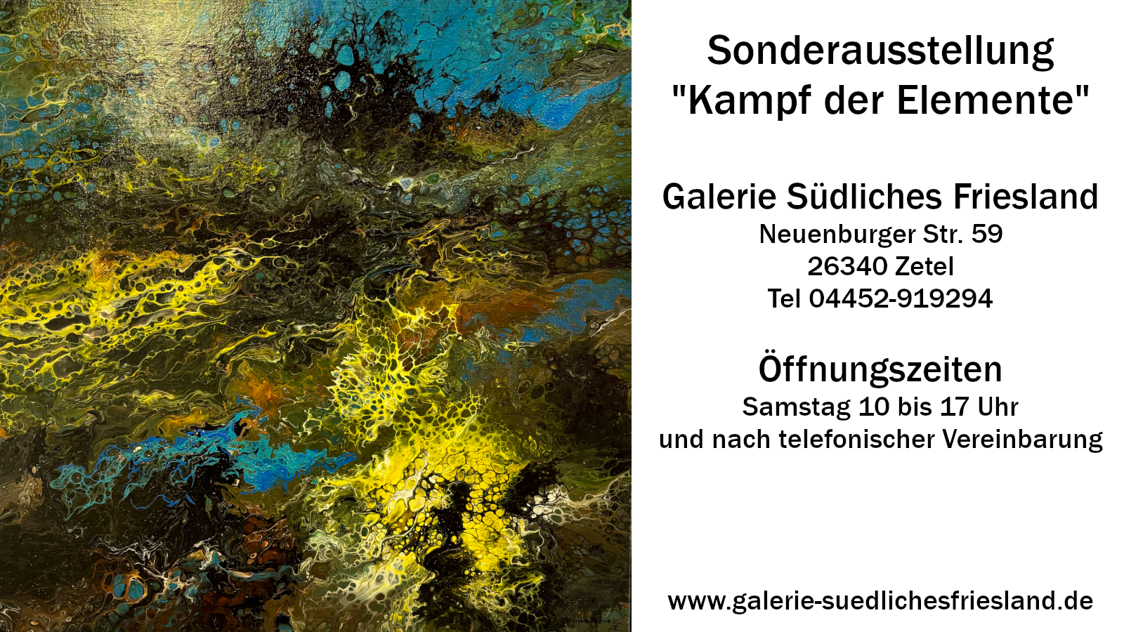 Sonderausstellung "Kampf der Elemente". Bilder von Uwe Schmalstieg. “Kampf der Elemente” lautet der Titel der Sonderausstellung anlässlich des 20jährigen Jubiläums der Galerie Südliches Friesland in Zetel. In der Galerie, die…