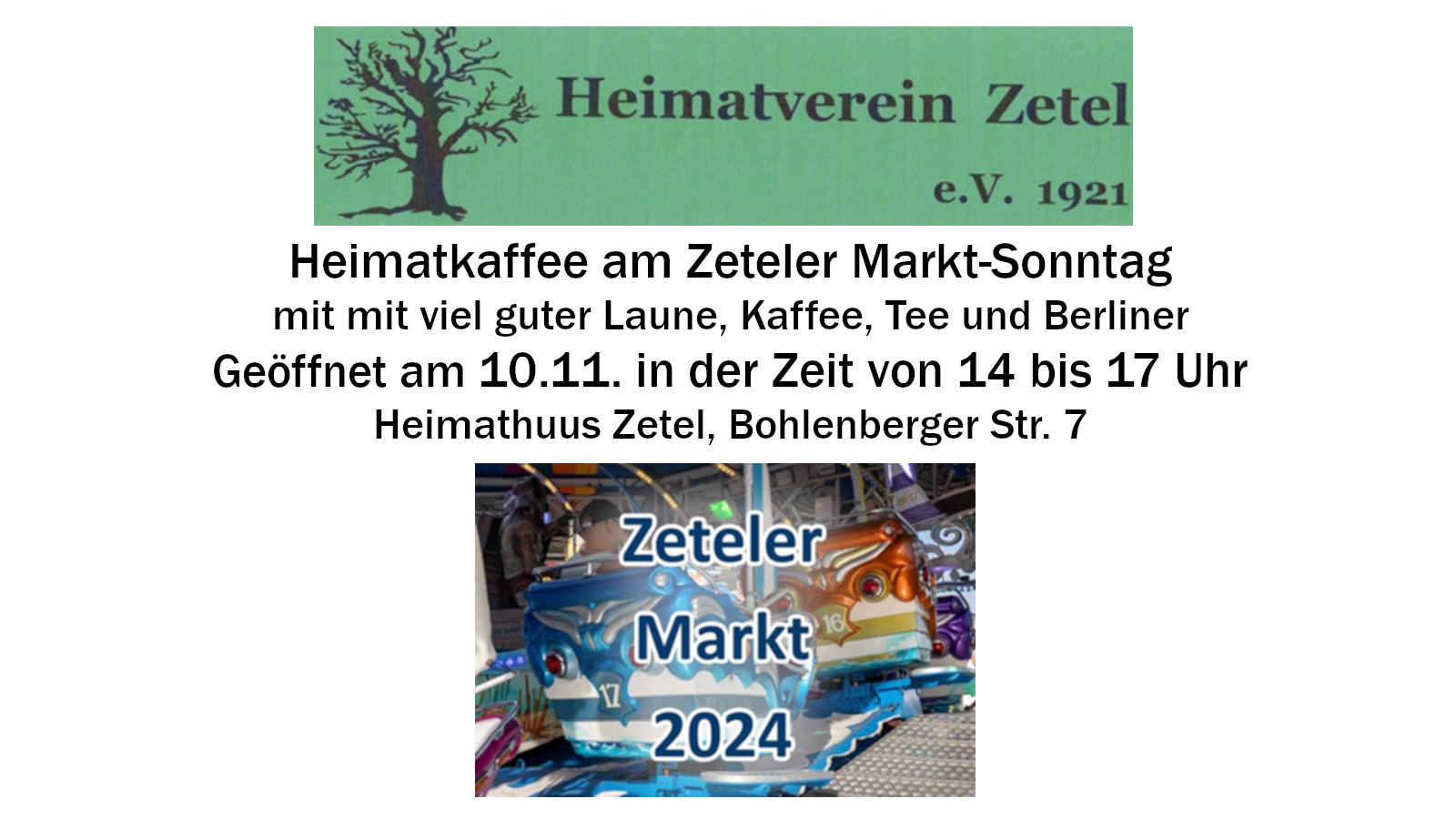Am 1.Dezember 2024 wollen wir wieder gemeinsam am 1. Advent unseren Weihnachtsnachmittag begehen. Beginn ist um 15:00 Uhr im Heimathuus. Der Nachmittag soll dann gegen 17:00 Uhr ausklingen. Ort: Heimathuus Zetel,… |