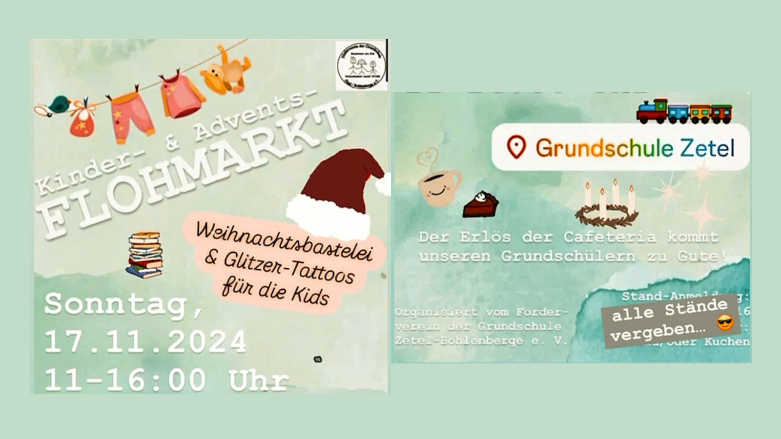 Kinder- und Adventsflohmarkt mit Weihnachtsbastelei. Am 17. November von 11 bis 16 Uhr. Wo? Grundschule Zetel, Schulstrasse. Der Erlös der Cafeteria kommt den Grundschülern zu Gute. Mit Weihnachtsbastelei und Glitzer-Tattoos…