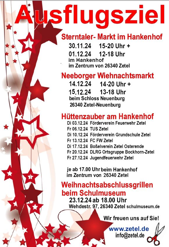 Tauchen Sie ein in die zauberhafte Welt des Zeteler Sterntaler-Marktes am ersten Adventswochenende. Die malerische Kulisse des Hankenhofs erstrahlt in festlichem Glanz und lädt Groß und Klein zu einem unvergesslichen…