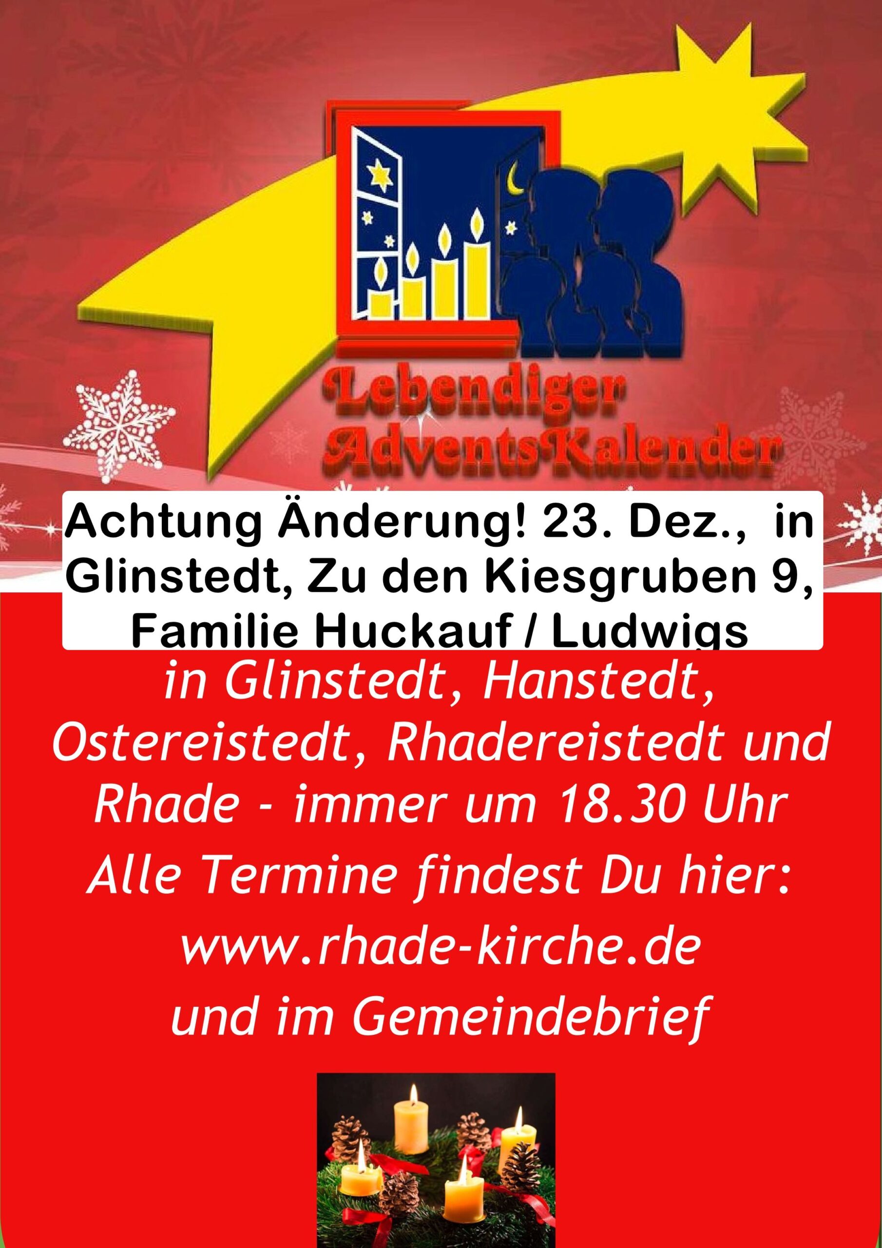 Fr 20. Dez. 18.30 h Rhade Am Steg 26 Birgit Arndt Sa 21. Dez. 18.30 h Hanstedt Löhweg 2 (DGH) Feuerwehr Hanstedt Mo 23. Dez. 18.30 h Glinstedt Zu den…