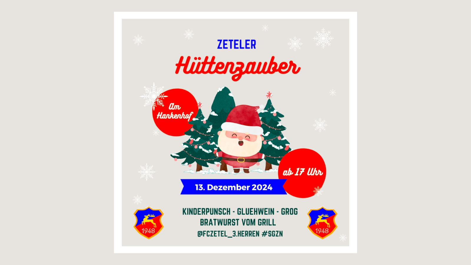 13. Dezember 2024 ab 17 Uhr Der FC FW Zetel versorgt euch mit Kinderpunsch, Glühwein, Grog und Bratwurst vom Grill. Schaut vorbei am Hankenhof, wir freuen uns auf euch!