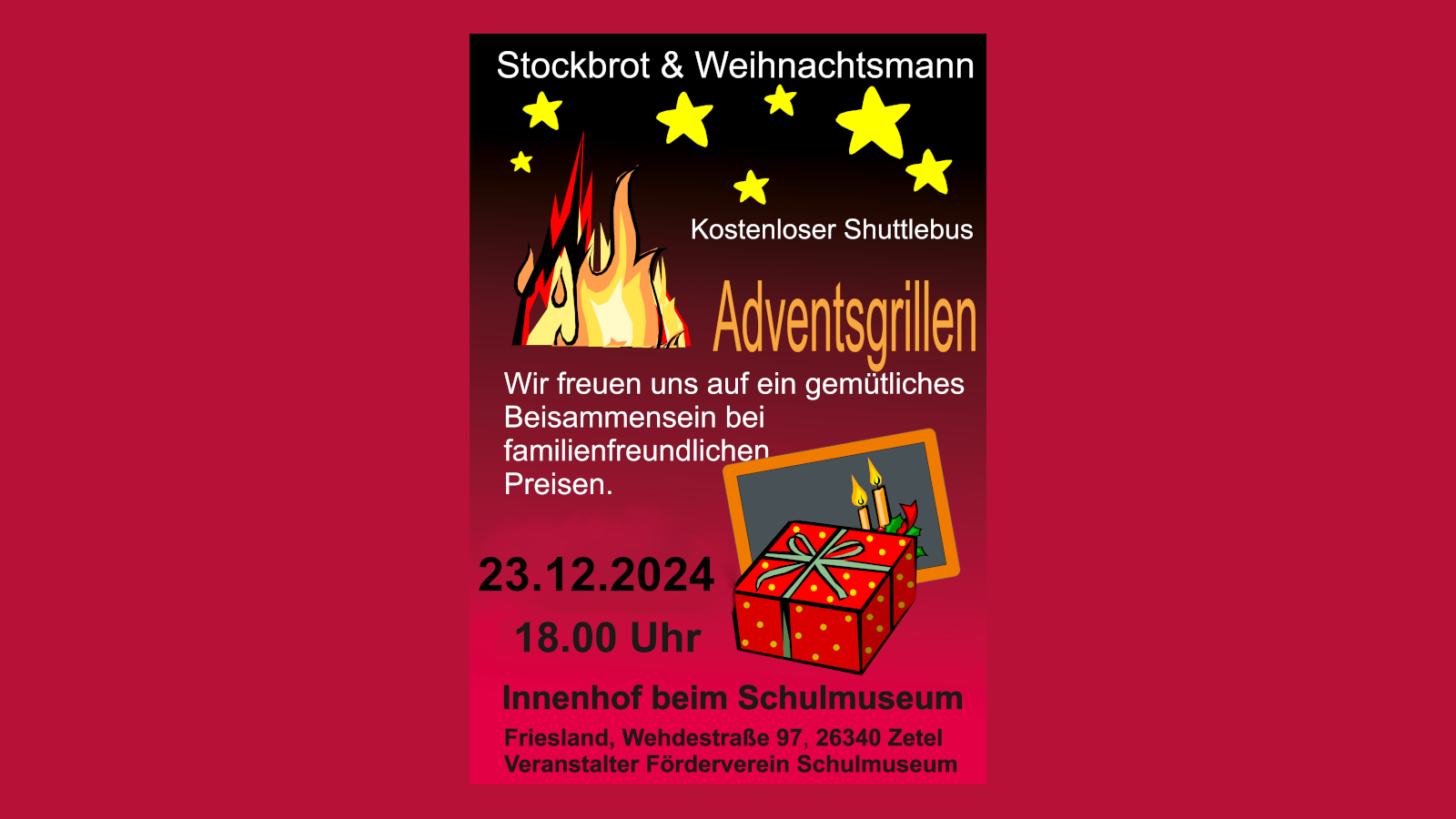Stockbrot und Weihnachtsmann, kostenloser Shuttlebus und Grillen im Innenhof des Schulmuseums. Wir freuen uns auf ein gemütliches Beisammensein in besonderer Atmosphäre. 23.12.2024 ab 18 Uhr Veranstaltungsort Schulmuseum Bohlenbergerfeld Wehdestr. 97… |