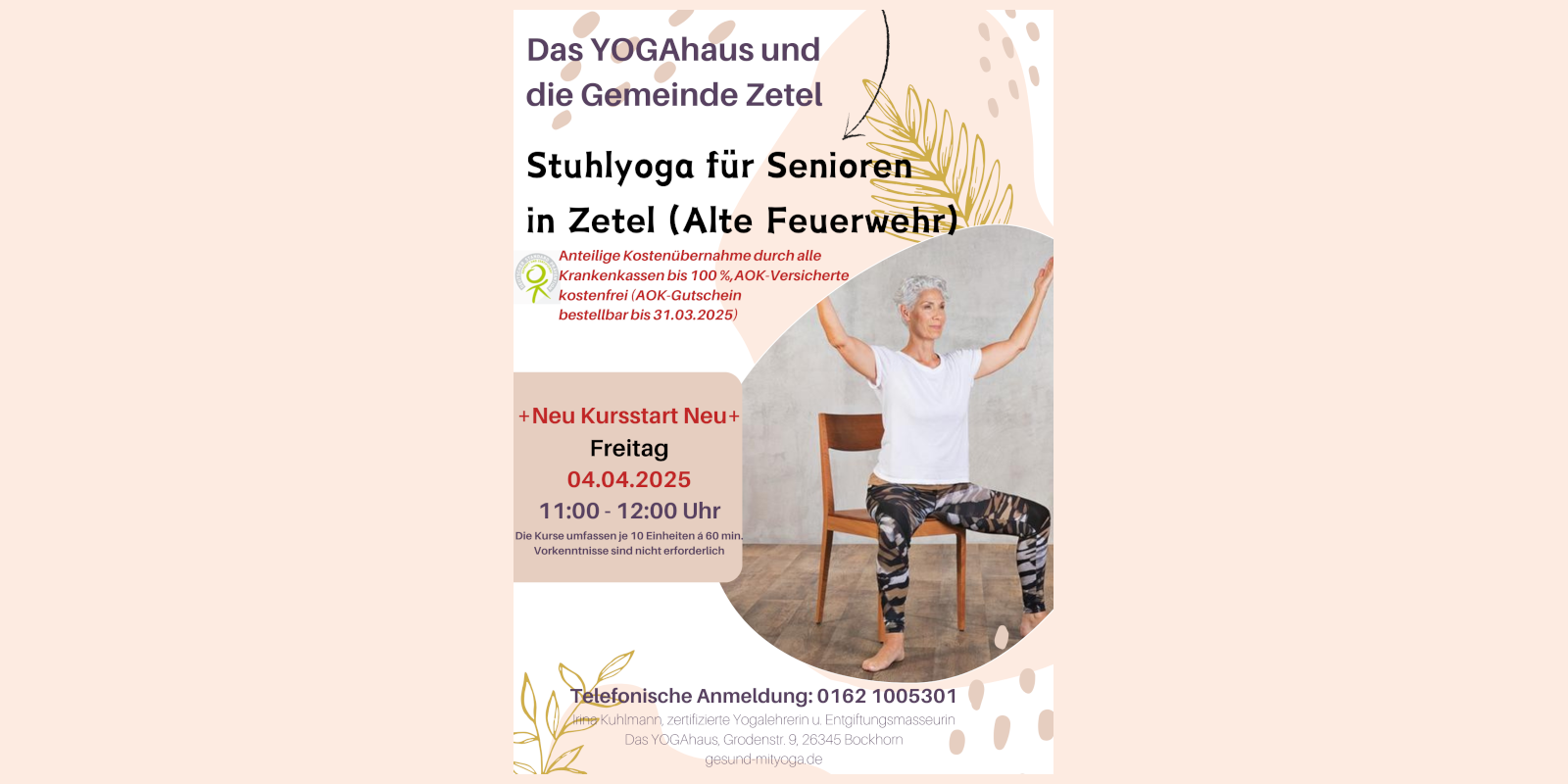 Stuhlyoga für Senioren in der Alten Feuerwehr, Markthamm, Zetel. Kursstart am 4. April 2025. Kurseinheit 11 bis 12 Uhr. Die Kurse umfassen je 10 Einheiten á 60 Minuten. Vorkenntnisse sind…