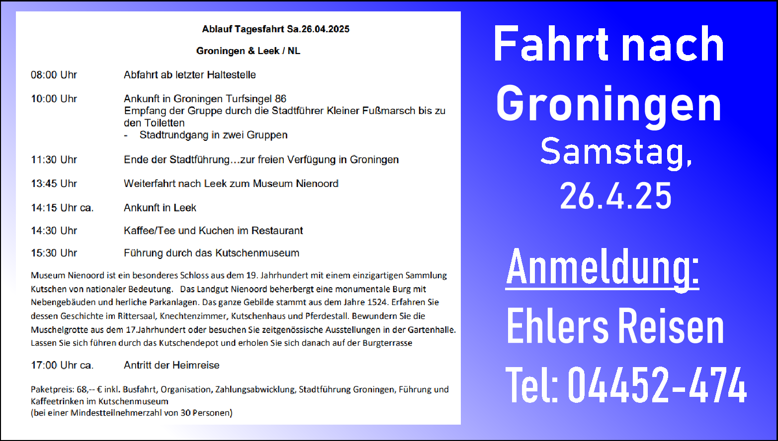 Fahrt nach Groningen am Samstag, 26. April. Die Fahrt beginnt in Zetel und wird mit Ehlers-Reisen durchgeführt. Anmeldungen direkt bei Ehlers unter 04452-474. Ablauf 08:00 Uhr Abfahrt ab letzter Haltestelle…