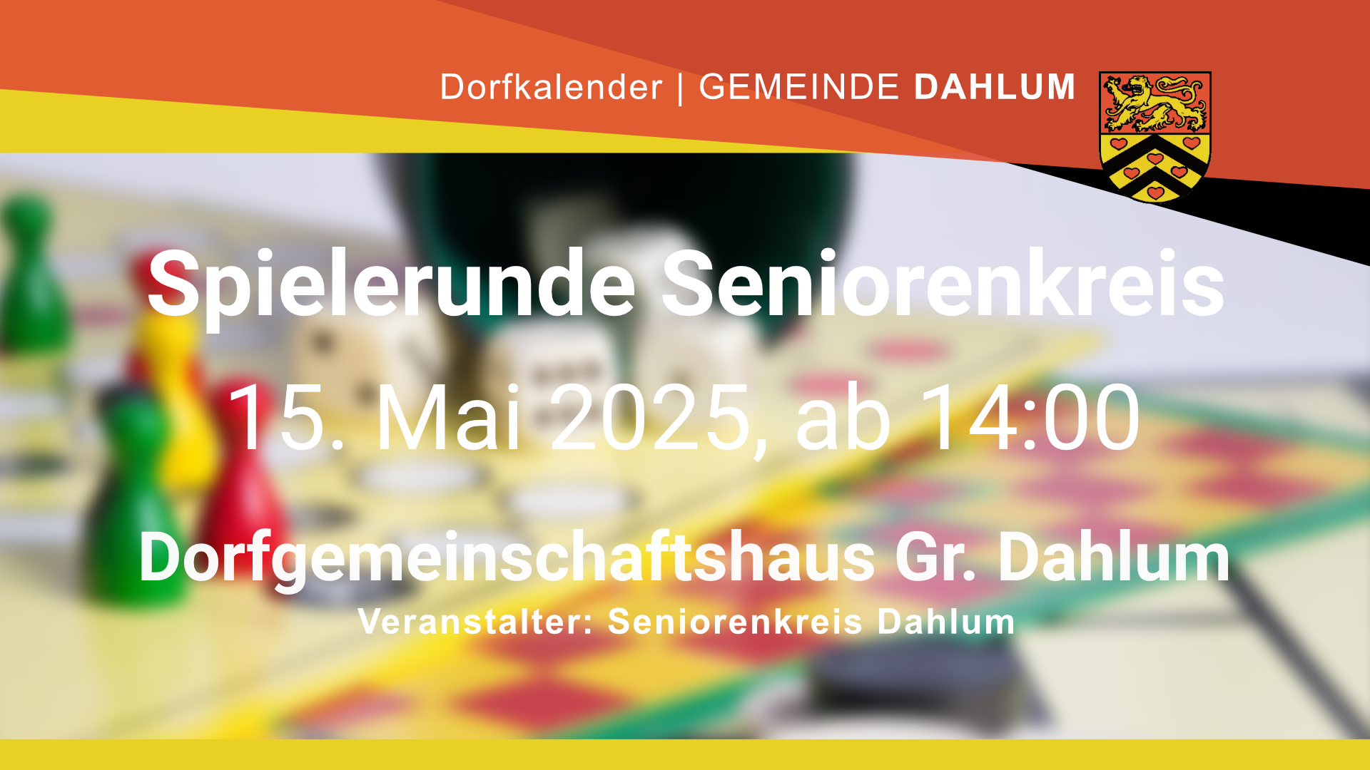 Der Seniorenkreis Dahlum trifft sich einmal im Monat zu einem gemeinsamen Spielenachmittag. Das nächste Treffen findet am Donnerstag, den 15.05. um 14:00 Uhr im DGH Groß Dahlum statt.