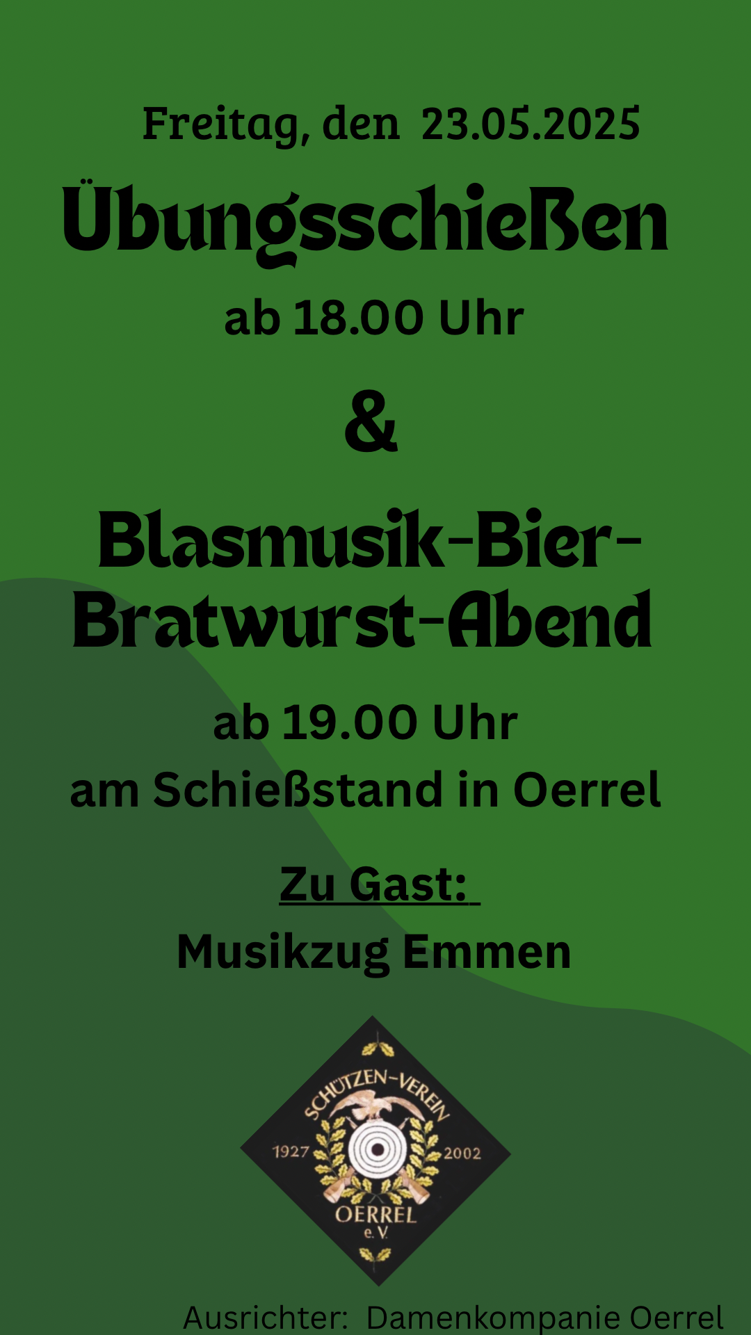Die Damenkompanie des Schützenvereins Oerrel lädt herzlich ein zum Übungsschießenam Freitag, den 23. Mai 2025 ab 18:00 Uhr. Besonderes Highlight:Ab 19:00 Uhr ist der Musikzug Emmen bei uns zu Gast…