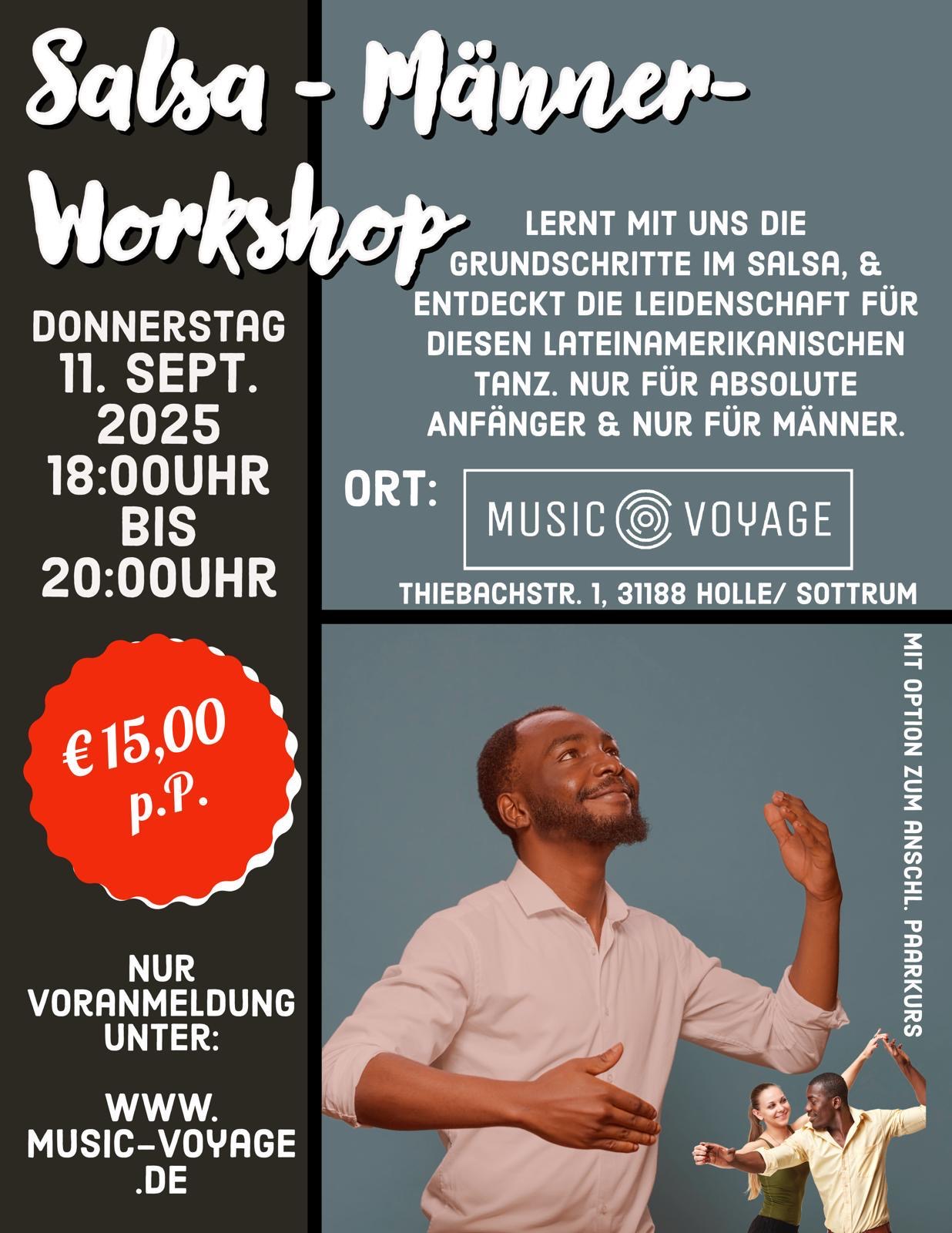 Nur für absolute Anfänger und nur für Männer! Lernt mit uns die Grundschritte im Salsa und entdeckt die Leidenschaft für diesen lateinamerikanischen Tanz. Do. 11.09.2025 18:00 Uhr bis 20:00 Uhr 15,00… |