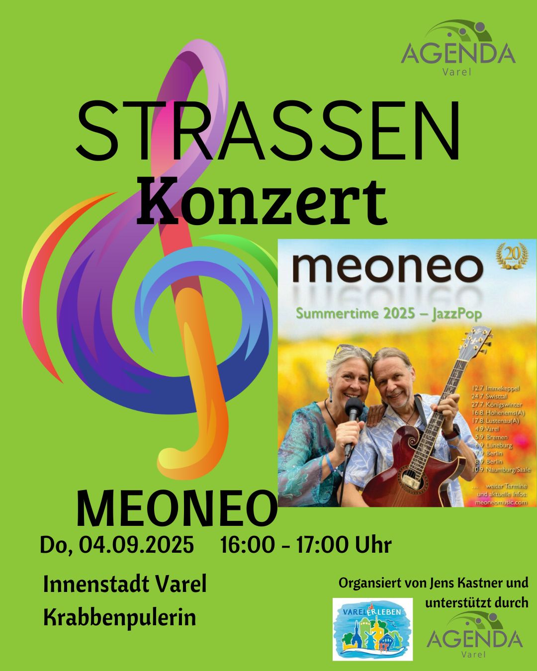 Meoneo Jazz Duo 🎷 Feine Jazzklänge am NachmittagDonnerstag, 4. September 2025, 16:00 Uhr – vor der Krabbenpulerin (Obernstraße).Das Meoneo Jazz Duo aus Bonn sorgt für entspanntes Sommerfeeling in der Fußgängerzone.✨… |