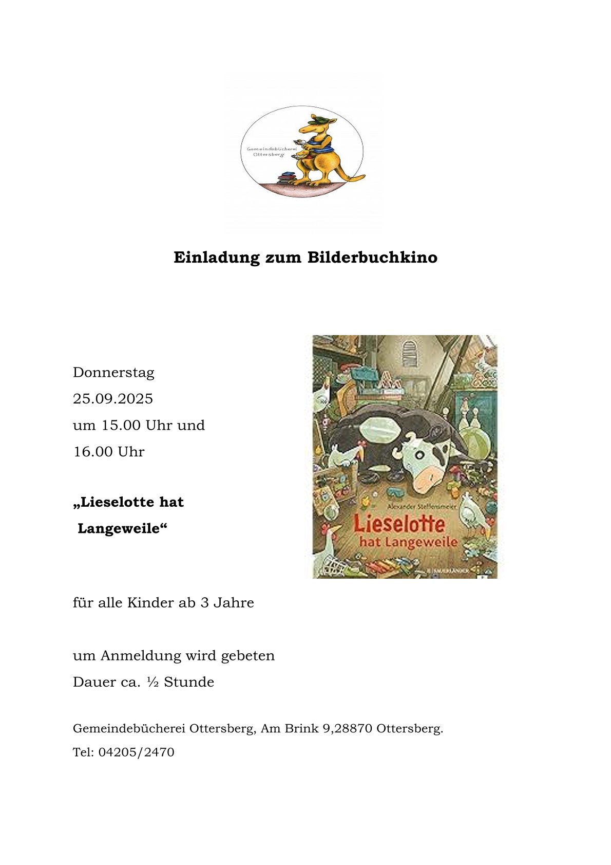Vorleseabend für Kinder ab 3 Jahre. Am Donnerstag, 18. September 2025 Beginn 17.00 Uhr, Eintritt frei Anmeldung unter: marco.hohmeister@web.de |