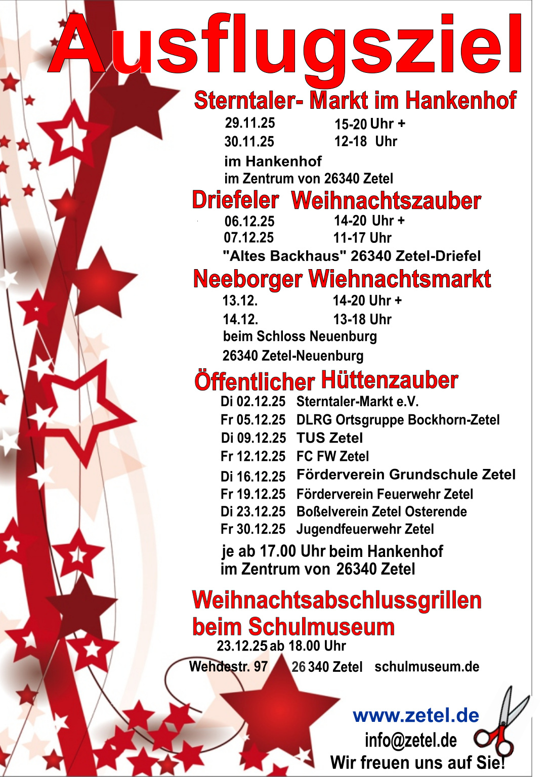 Der traditionelle Weihnachtsmarkt in Mulsum wird am Samstag, dem 6. Dezember 2025, abgehalten. Er wird organisiert vom Club Gemütlichkeit, der Jugendfeuerwehr, den Jungschützen, dem Mulsumer Heimat- und Kulturverein und dem…